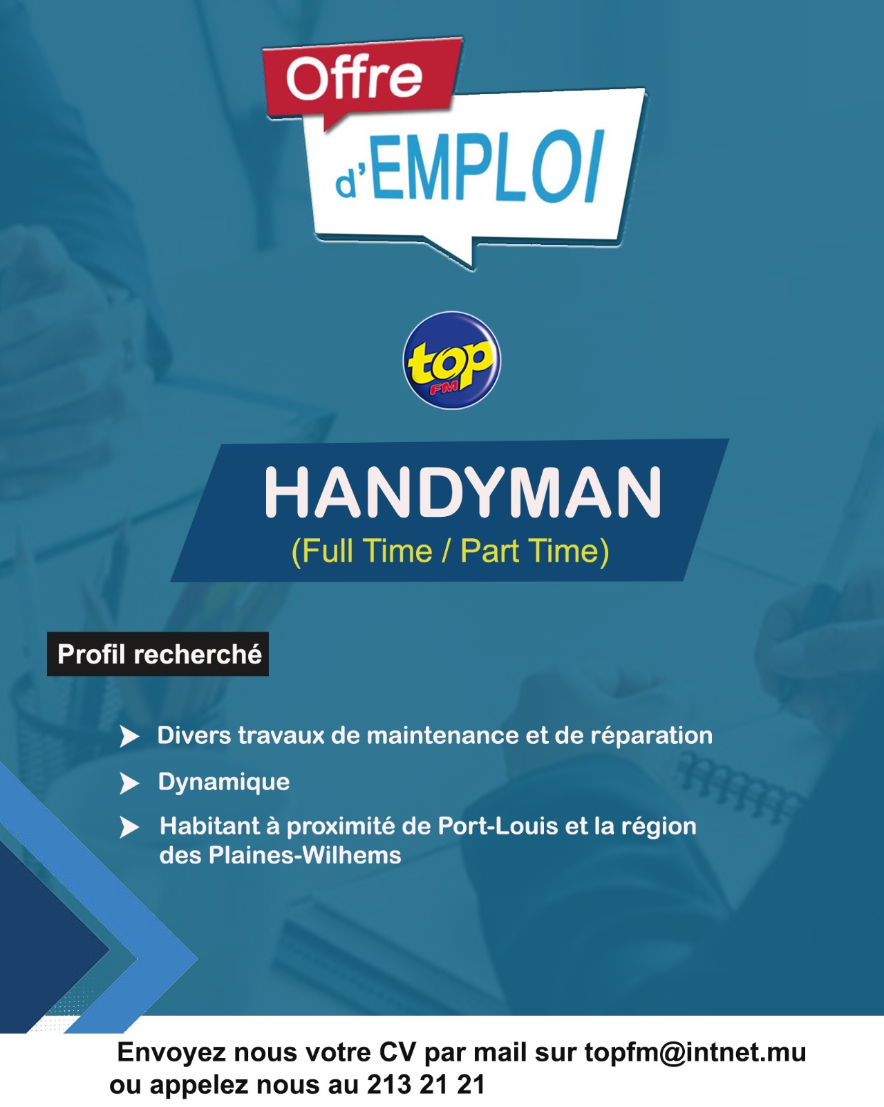 Jessila: Le 06/02/2023 à 16:18 | MAJ à 06/02/2023 à 16:18 Main picture Publié : Le 06/02/2023 à 16:18 | MAJ à 06/02/2023 à 16:18 FB TW WS Profil recherché : Divers travaux de maintenance et de réparation Dynamique Habitant à proximité de Port-Louis et la région des Plaines-Wilhems Envoyez votre CV: topfm@intnet.mu OU Appelez nous au : 213 21 21