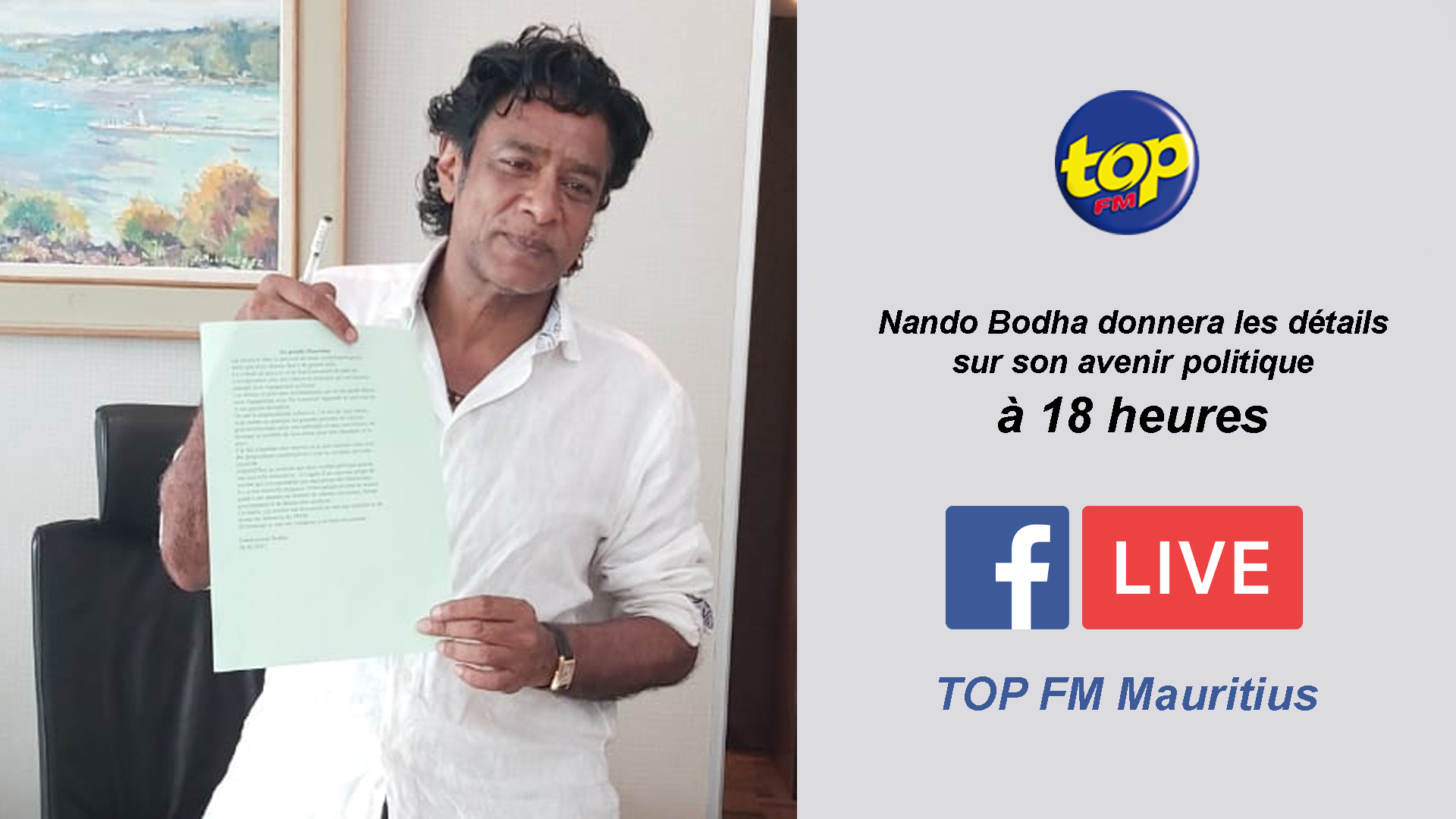 Naresh: Le 07/02/2021 à 17:14 | MAJ à 07/02/2021 à 17:14 Main picture Publié : Le 07/02/2021 à 17:14 | MAJ à 07/02/2021 à 17:14 FB TW WS L’annonce a été faite sur sa page Facebook en début d’après-midi. Par le biais d’une vidéo, Nando Bodha expliquera la raison de sa démission et surtout, il se penchera sur son avenir politique. Une intervention à suivre en direct sur Top Fm et sur notre page Facebook, TOP FM Mauritius.