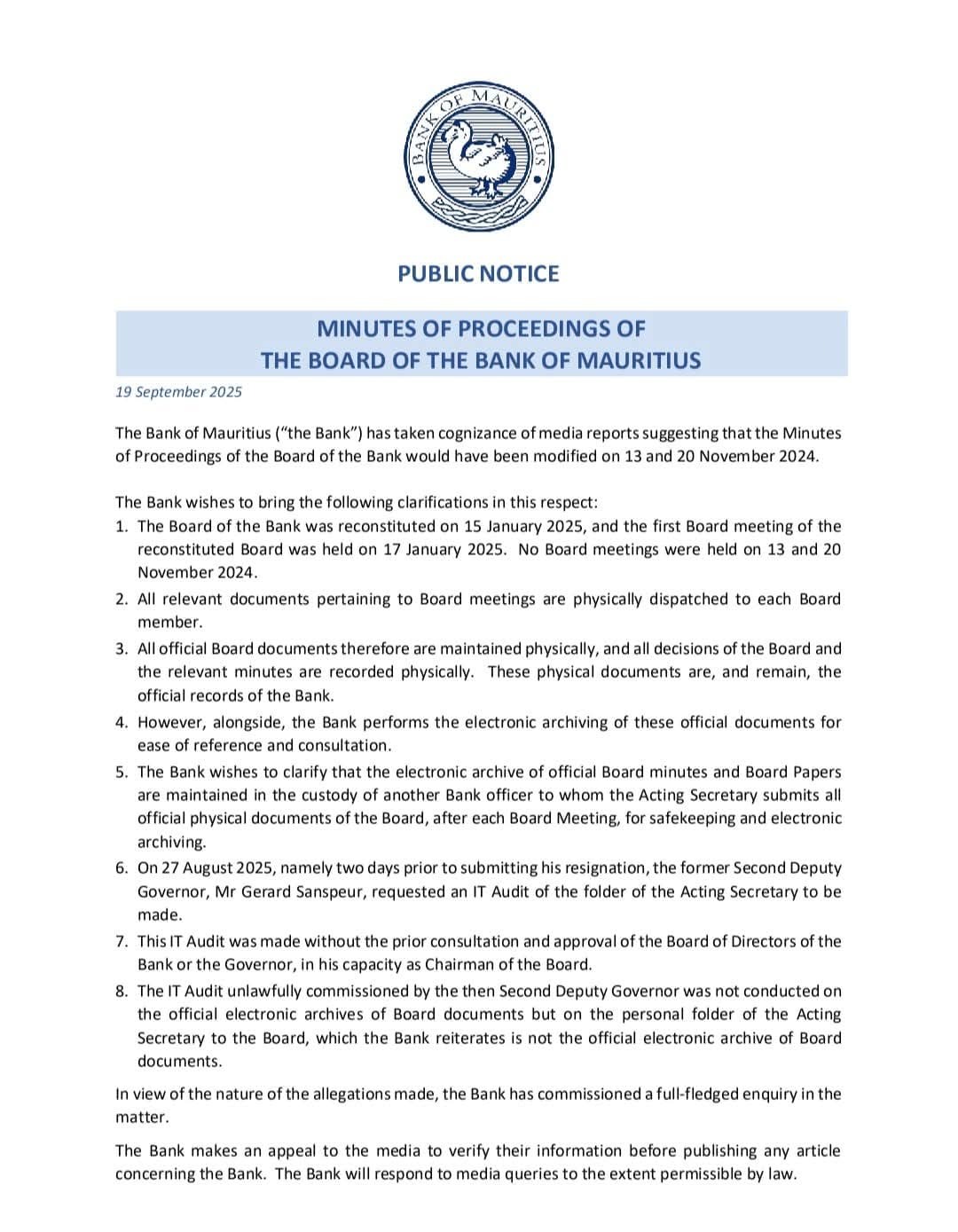 La BoM révèle par ailleurs que le 27 août 2025, soit deux jours avant sa démission, l’ancien Second deputy Governor, Gérard Sanspeur, a demandé un audit informatique du dossier de l’Acting Secretary. Cet audit, réalisé « sans l’aval du Conseil ni du Gouverneur », n’a pas porté sur les archives officielles mais sur un dossier personnel, insiste la Banque.