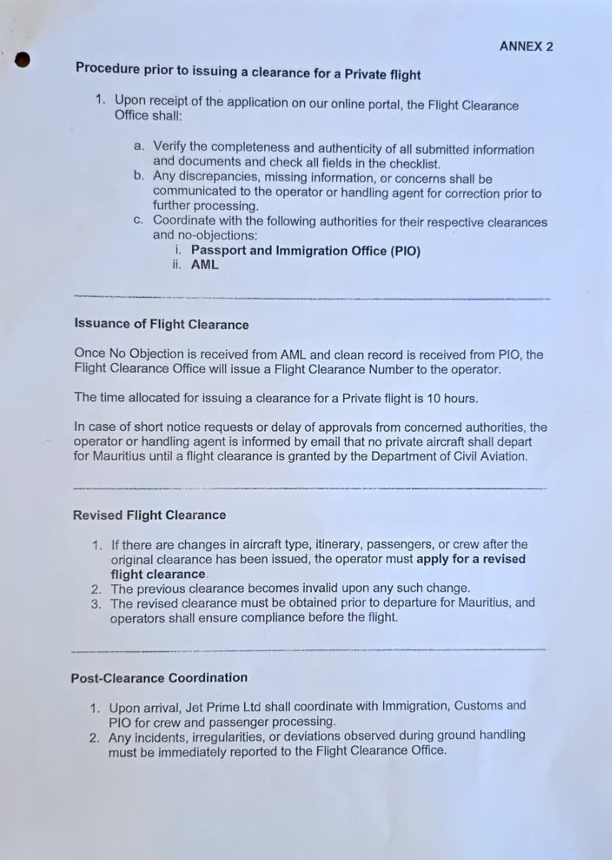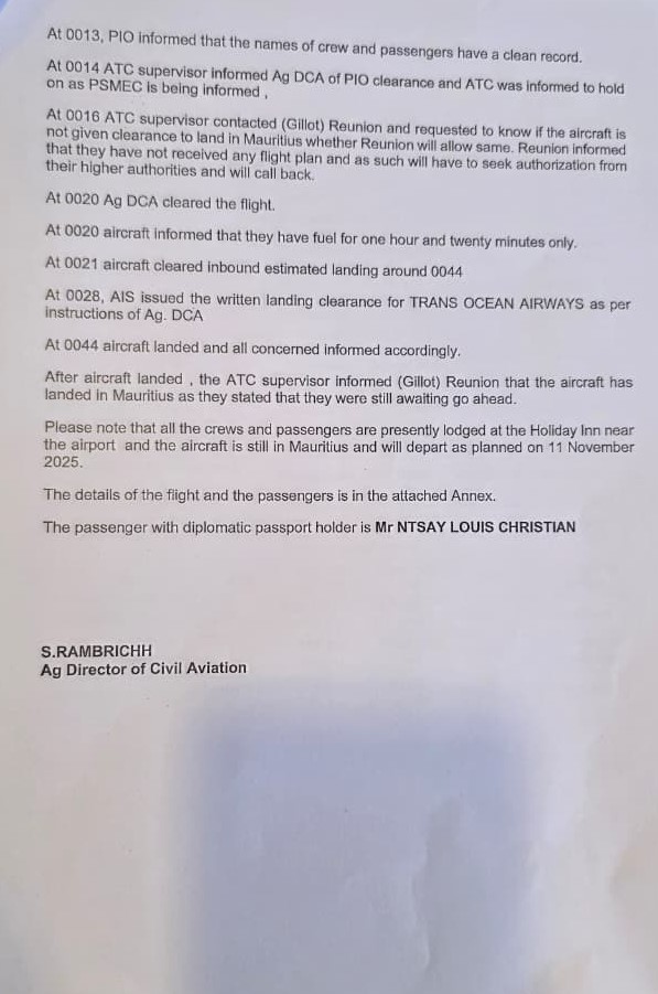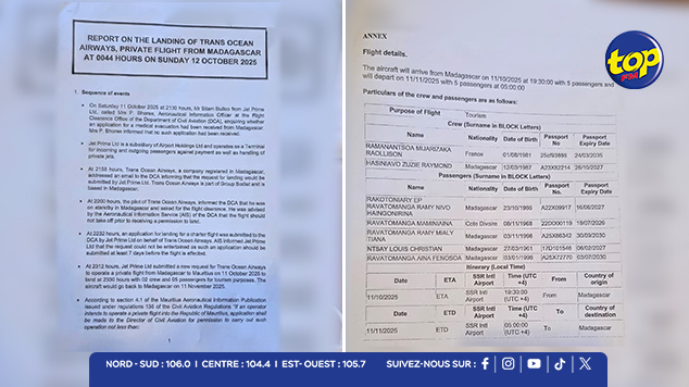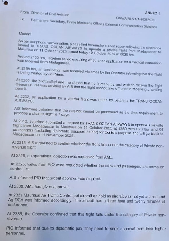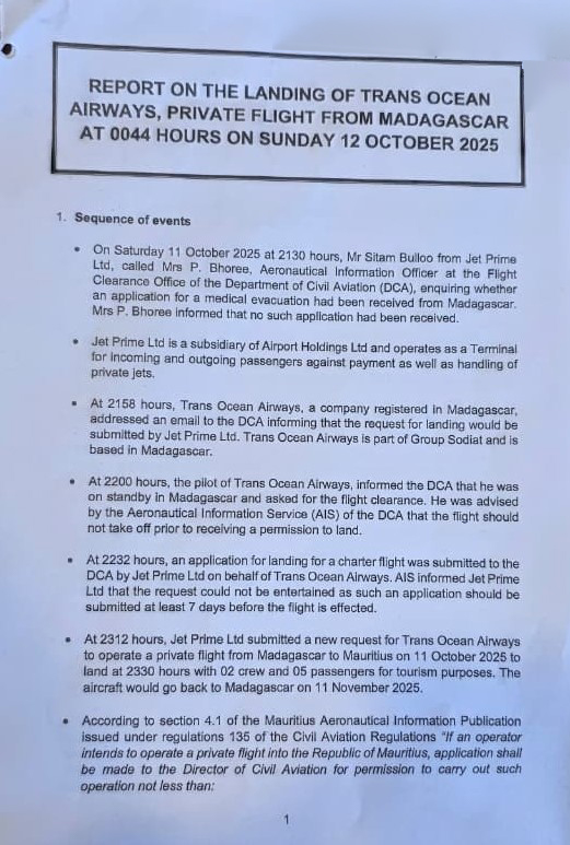 Il s’agit d’un rapport détaillé retraçant, minute par minute, les événements et les personnes concernées depuis que le jet privé de Trans Ocean Airways a formulé sa demande d’atterrissage à Maurice le 11 octobre. Le Directeur de l’Aviation civile précise qu’à 21 h 30, le 11 octobre, Jet Prime a sollicité le département pour s’enquérir d’une éventuelle demande d’évacuation médicale en provenance de Madagascar.