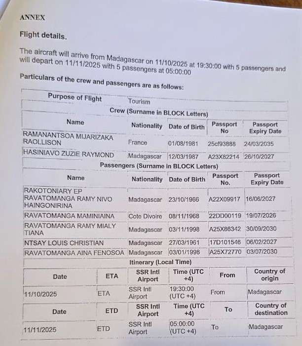 Une fois la requête du département de l’Aviation civile transmise à la tour de contrôle de Madagascar le 14 octobre, il est noté que le jet avait déjà décollé à 22 h 19, alors que la demande d’atterrissage avait été soumise à 23 h 12 le 11 octobre.