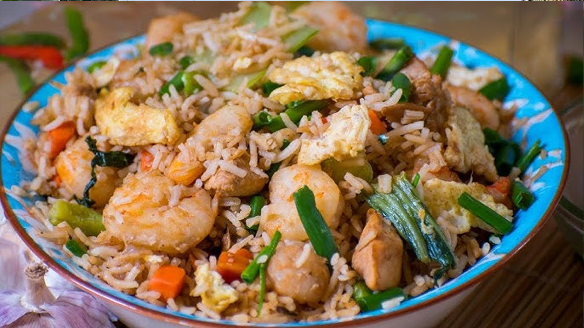 Mettre à chauffer l’huile dans un wok et faire revenir l’oignon, rajouter les champignons, le poulet et les crevettes et laisser cuir pendant 5 minutes.