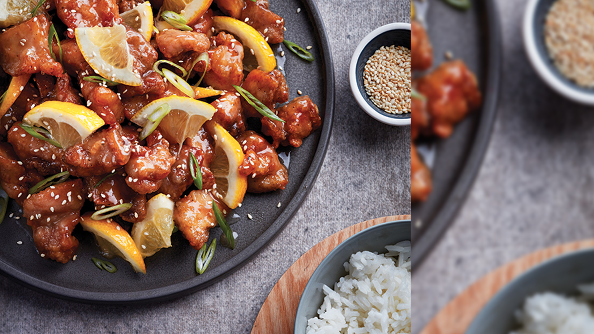 - Dans une grande casserole, sur feu moyen-vif, fouetter les 4 c. à thé de fécule de maïs réservée avec le sucre, le jus de citron et le bouillon de poulet jusqu’à ce que la sauce épaississe et bouillonne, 1 minute. Ajouter le poulet frit et les morceaux de citron, et mélanger. Transférer dans un plat de service, puis garnir des graines de sésame et des oignons verts.