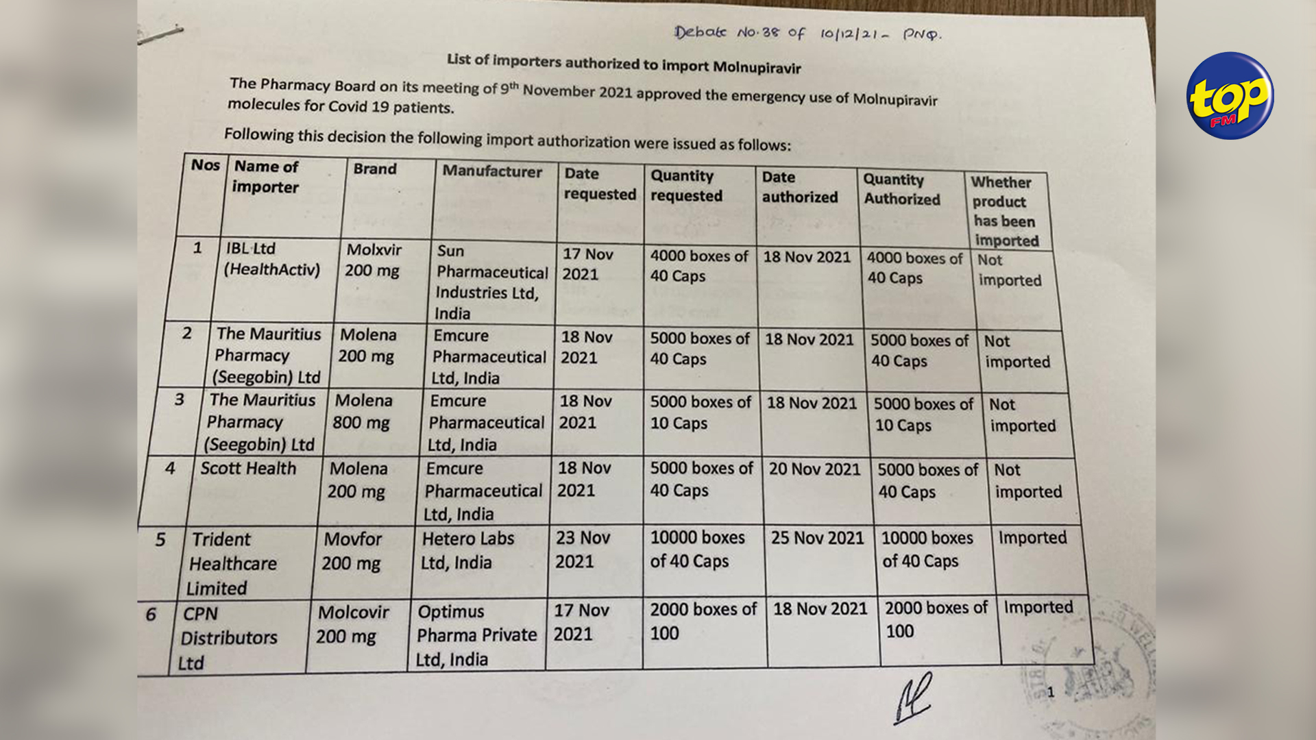 C’est le ministre de la Santé qui a déposé ce document au Parlement. Il indique que suite à une réunion le 9 novembre, le Pharmacy Board a approuvé l’utilisation en urgence du Molnupiravir pour traiter la Covid-19.