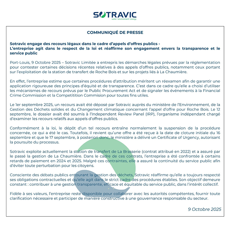 Port-Louis, 9 Octobre 2025 – Sotravic Limitée a entrepris les démarches légales prévues par la réglementation pour contester certaines décisions récentes relatives à des appels d’offres publics, notamment ceux portant sur l’exploitation de la station de transfert de Roche Bois et sur les projets liés à La Chaumière.