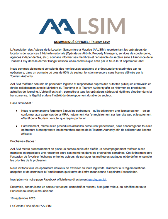 L’introduction de la Tourism Fee, annoncée dans le Budget 2025-2026 et précisée par un communiqué de la Mauritius Revenue Authority (MRA), vient bousculer un secteur de la location saisonnière encore massivement informel à Maurice. Selon l’Association des Acteurs de la Location Saisonnière (AALSIM), près de 90 % des opérateurs – qu’il s’agisse d’Airbnb, de Property Managers ou de services de conciergerie – exercent toujours sans licence délivrée par la Tourism Authority.