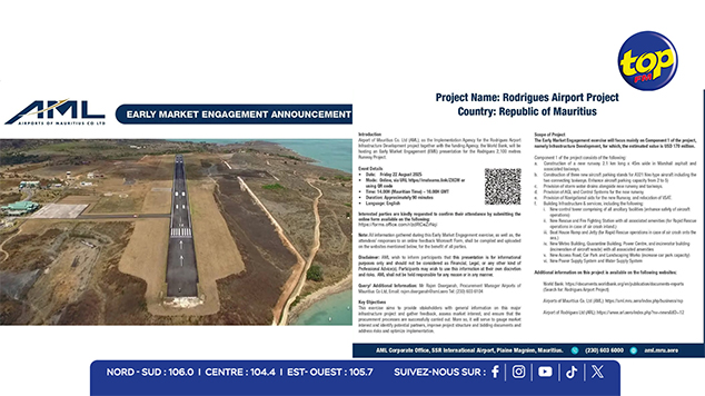 Airports of Mauritius Co. Ltd (AML), en tant qu’agence d’exécution, a annoncé la tenue d’une présentation préliminaire le vendredi 22 août 2025, afin de mobiliser les acteurs potentiels et de recueillir leurs avis.