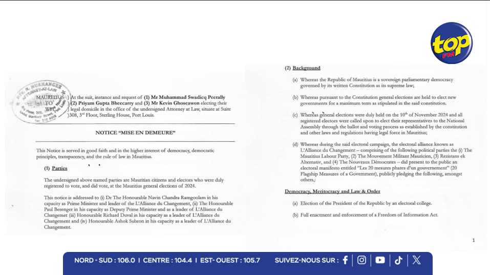 Trois électeurs mauriciens – Muhammad Swadicq Peerally, Priyam Gupta Bheecarry et Kevin Ghoseawon – ont adressé une mise en demeure au gouvernement et aux leaders de l’Alliance du Changement : Navin Ramgoolam, Paul Bérenger, Richard Duval et Ashok Subron