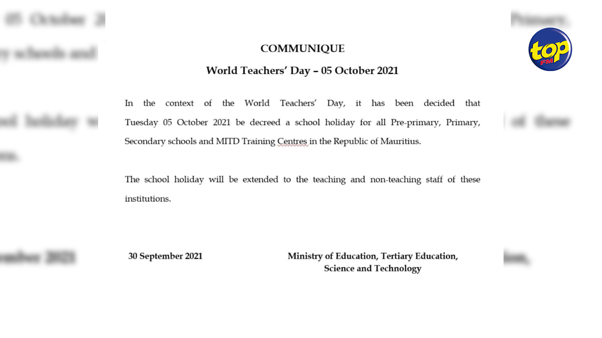 Jessila: Le 30/09/2021 à 16:32 | MAJ à 10/07/2024 à 17:40 Main picture Publié : Le 30/09/2021 à 16:32 | MAJ à 10/07/2024 à 17:40 FB TW WS Cela concerne toutes les écoles maternelles, primaires et secondaires, ainsi que les centres de formation de la MITD. Les portes de ces institutions seront donc fermées ce mardi.